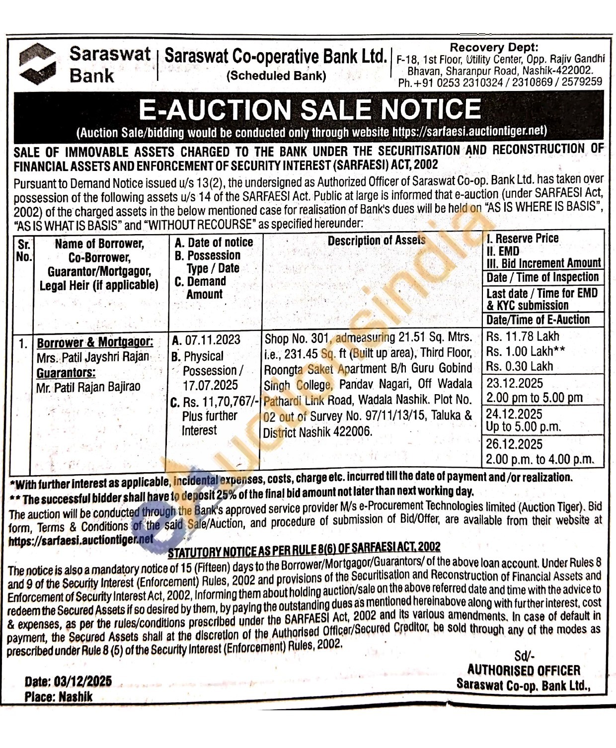 Shop No. 301, admeasuring 21.51 Sq. Mtrs. i.e., 231.45 Sq. ft (Built up area), Third Floor, Roongta Saket Apartment B/h Guru Gobind Singh College, Pandav Nagari, Off Wadala - Pathardi Link Road, Wadala Nashik. Plot No. 02 out of Survey No. 97/11/13/15, Taluka & District Nashik 422006.