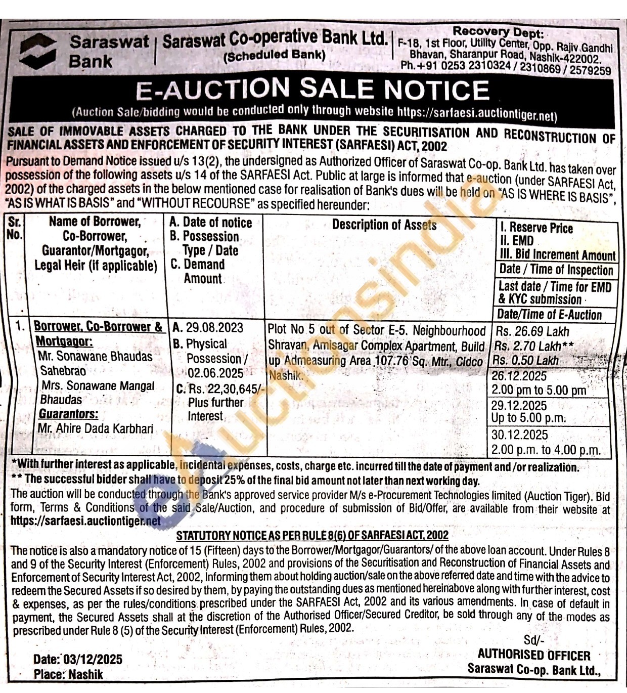 Plot No 5 out of Sector E-5. Neighbourhood Shravan, Amisagar Complex Apartment, Build up Admeasuring Area 107.76 Sq. Mtr., Cidco Nashik