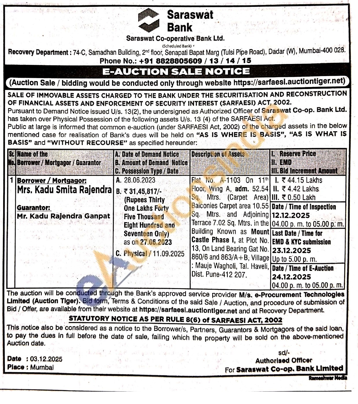 Flat No. A-1103 On 11th Floor, Wing A, adm. 52.54 Sq. Mtrs. (Carpet Area) Balconies Carpet area 10.55 Sq. Mtrs. and Adjoining Terrace 7.02 Sq. Mtrs. in the Building Known as Mount Castle Phase I, at Plot No. 13, On Land Bearing Gat No. 860/6 and 863/A+B; Village : Mauje Wagholi, Tal. Haveli, Dist. Pune-412 207.