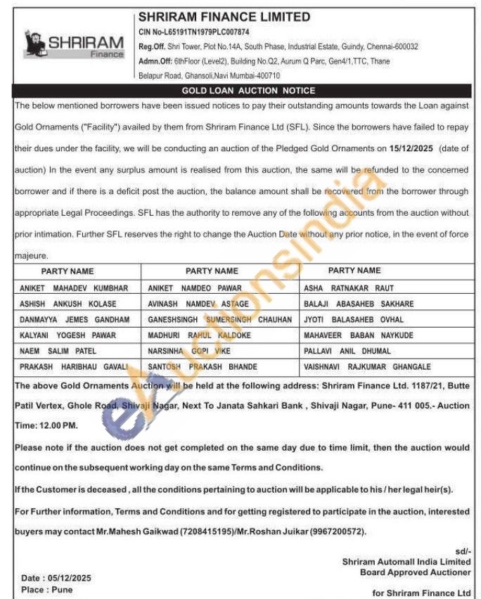 Shriram Finance Ltd Gold Auctions Auction in Pune
