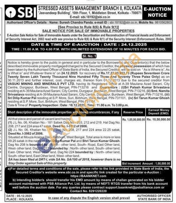 All that piece and parcel of vacant land having (1) J.L No. 06, Khatian No.- 181 Sabek Dag No.-203, 212 and 219. Hal Dag No. 208, 217 and 224 area 47 satak, Deed No. 1-3112 of 2006. Situated at Mouza Araipur Dist.-Birbhum, West Bengal, Total area is more or less 69.25 satak in the name of Shri Dilip Kumar Pal and Shri Tarun Kumar Ghosh. Dag No 208 is bounded by: North-other land, South Road, East Other land, West-other land. Dag No 217 bounded by: North-other land, South- other land, East- Other land, West- other land. Dag No 224 bounded by: North- other land, South-other land, East Other land, West-other land.