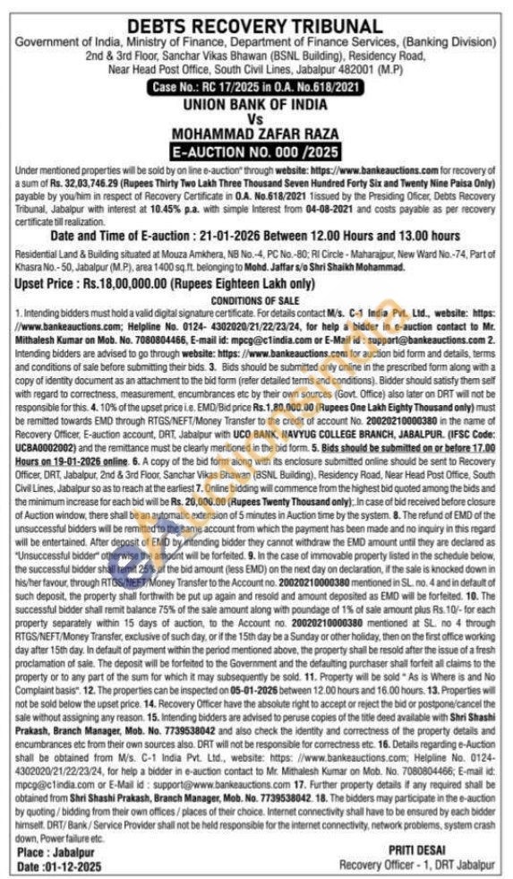Residential Land & Building situated at Mouza Amkhera, NB No.-4, PC No.-80; RI Circle-Maharajpur Khasra No.-50, Jabalpur (MP), area 1400 sq.ft. belonging to Mohd. Jaffar s/o Shri Shaikh Mohammad.