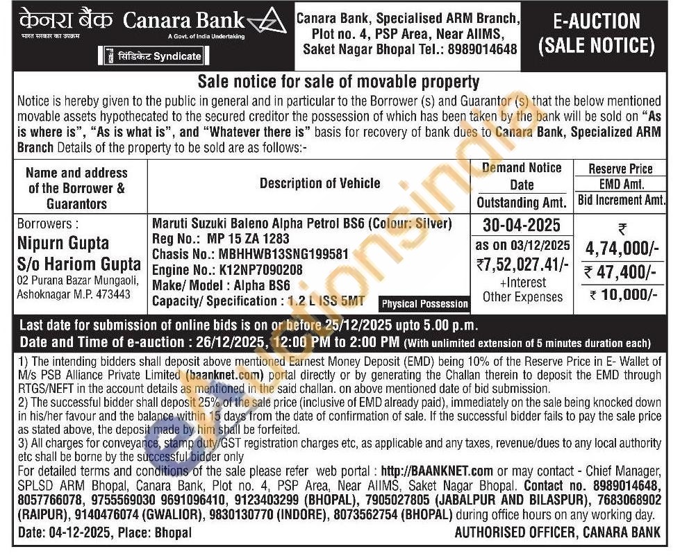 Maruti Suzuki Baleno Alpha Petrol BS6 (Colour: Silver) Reg No.: MP 15 ZA 1283 Chasis No.: MBHHWB13SNG199581 Engine No.: K12NP7090208 Make/Model: Alpha BS6 Capacity/ Specification: 1.2 L ISS 5MT