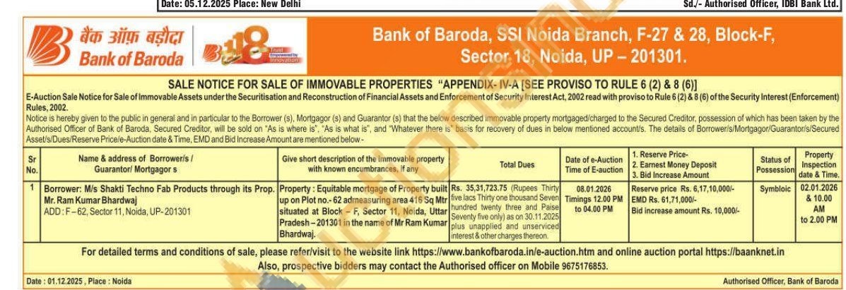 Property: Equitable mortgage of Property built up on Plot no.-62 admeasuring area 416 Sq Mtr situated at Block - F, Sector 11. Noida, Uttar Pradesh-201301 in the name of Mr Ram Kumar Bhardwaj.