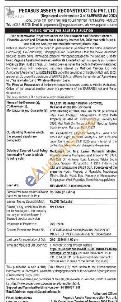 Mortgaged by: Mrs. Laxmi Mallinath Mhetre: Property bearing Grampanchayat Property No 3938 Mali Galli On Nimbargi Road. Mandrup Taluka South Solapur. Solapur, Maharashtra- 413221, India in the total land admeasuring 999.38 Sqft. Boundaries of the property: North: Property of Malsiddha Madolappa Mhatre, South Road, East: Property of Bhimasankar Shingadgoan, West: Property of Suresh Madolappa Mhetre