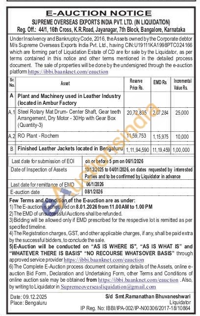 Plant and Machinery used in Leather Industry (located in Ambur Factory
