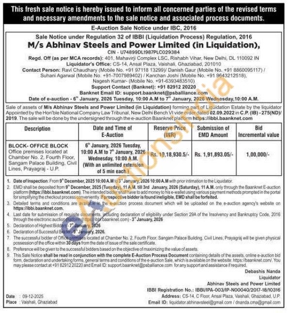 BLOCK-OFFICE BLOCK Office premises located at Chamber No. 2, Fourth Floor, Sangam Palace Building. Civil Lines, Prayagraj-U.P