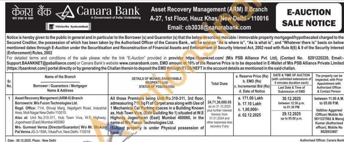 All those Premises being Unit No.310-311, 3rd floor, admeasuring 711 Sq Ft of Carpet area along with Use of 1 Mechanical Car Parking spaces in a Building Known as, Hub Town Viva, (Sale Building No 1) situated at W.E Highway Jogeshwari (East) Mumbai 400060, in the name of M/s Fucon Technologies Ltd.