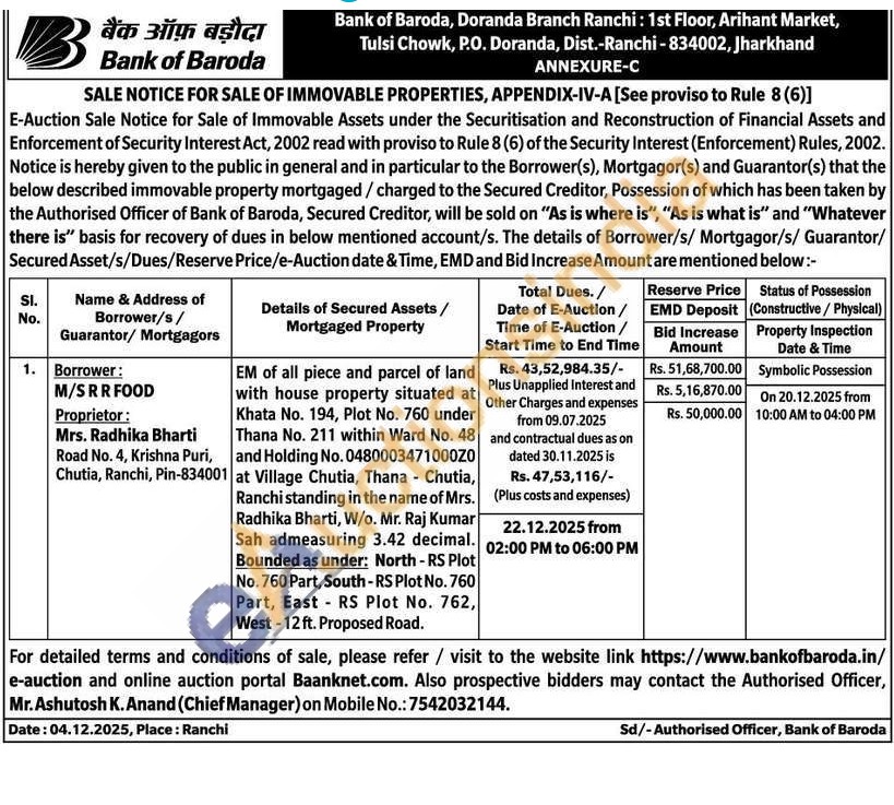 EM of all piece and parcel of land with house property situated at Khata No. 194, Plot No. 760 under Thana No. 211 within Ward No. 48 and Holding No. 048000347100020 at Village Chutia, Thana Chutia, Ranchi standing in the name of Mrs. Radhika Bharti, W/o. Mr. Raj Kumar Sah admeasuring 3.42 decimal. Bounded as under: North - RS Plot No. 760 Part, South - RS Plot No. 760 Part, East RS Plot No. 762, West-12 ft. Proposed Road.
