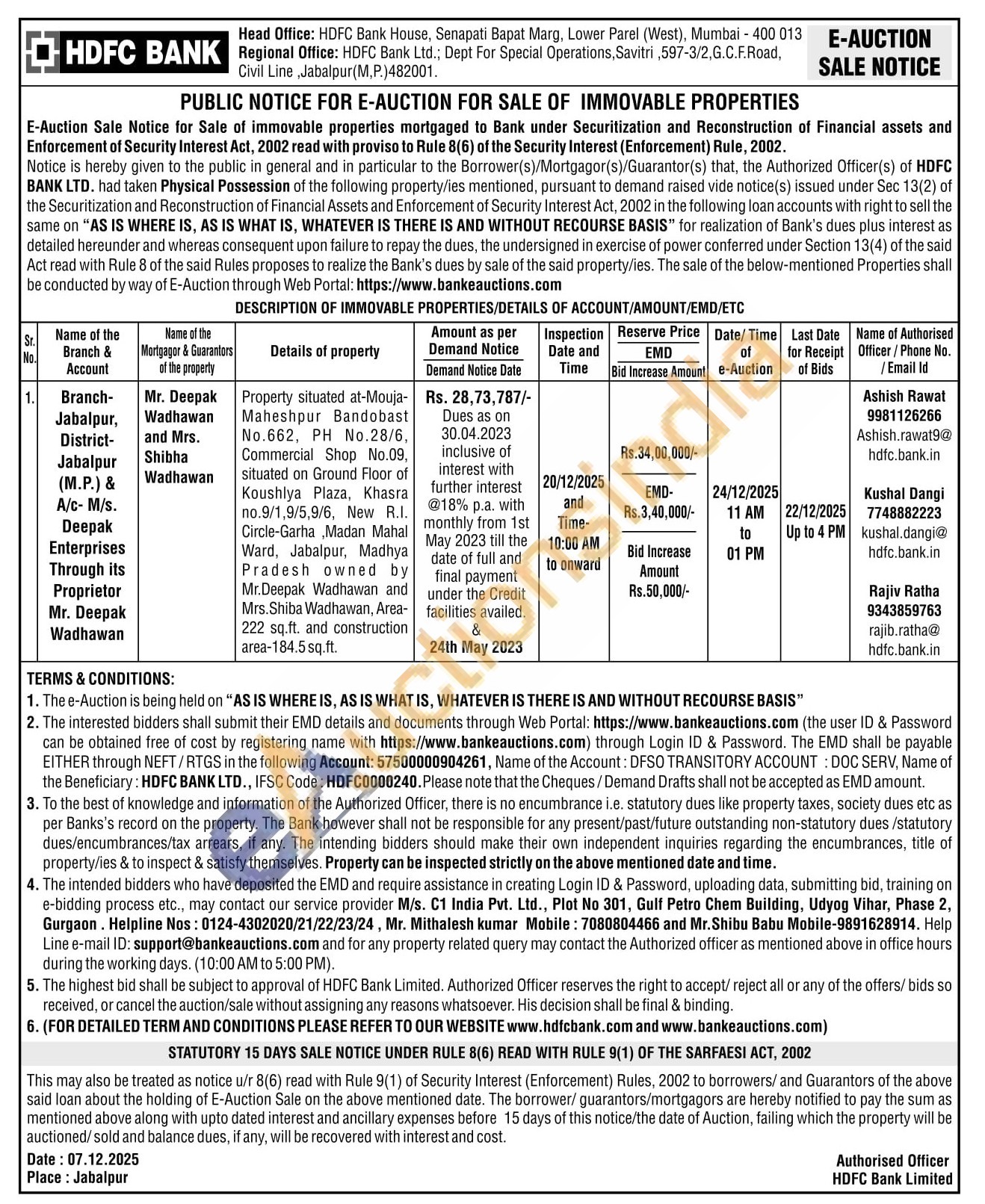 Property situated at-Mouja-Maheshpur Bandobast No.662. PH No.28/6. Commercial Shop No.09. situated on Ground Floor of Koushlya Plaza, Khasra no.9/1,9/5,9/6, New R.I. Circle-Garha Madan Mahal Ward, Jabalpur, Madhya Pradesh owned by Mr.Deepak Wadhawan and Mrs.Shiba Wadhawan, Area-222 sq.ft. and construction area-184.5 sq.ft.