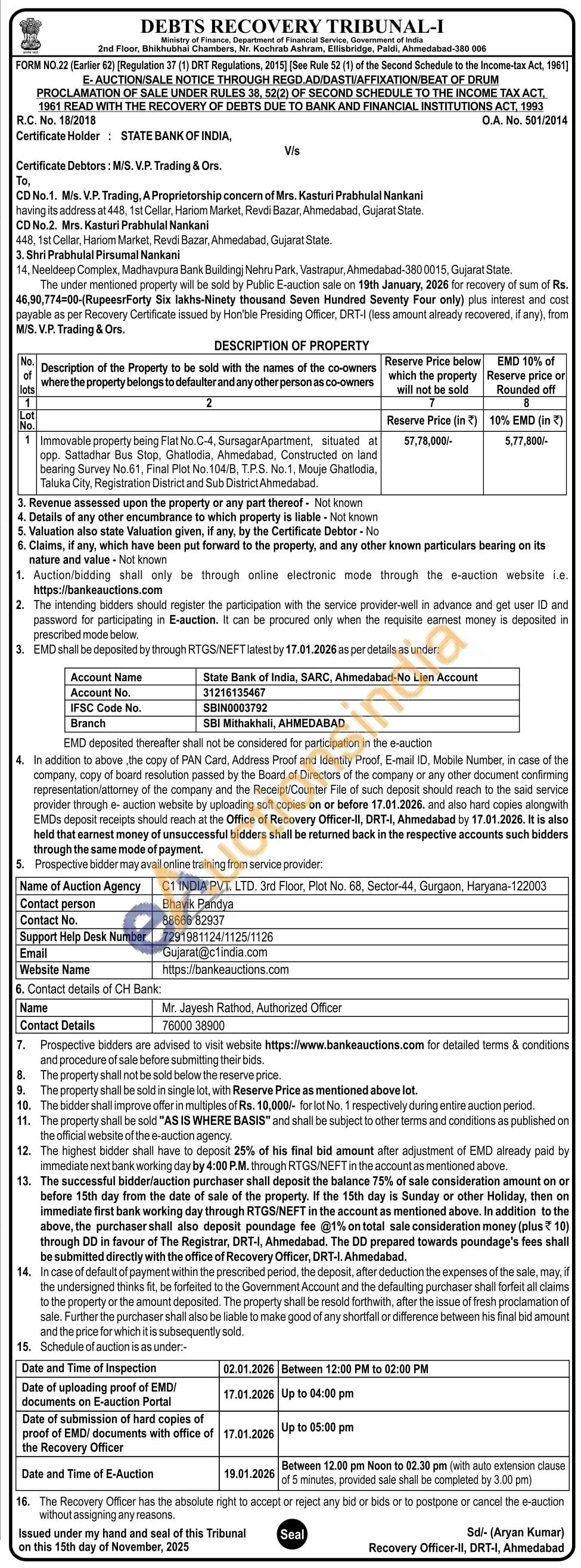 Immovable property being Flat No. C-4, SursagarApartment, situated at opp. Sattadhar Bus Stop, Ghatlodia, Ahmedabad, Constructed on land bearing Survey No.61, Final Plot No. 104/B, T.P.S. No. 1, Mouje Ghatlodia, Taluka City, Registration District and Sub District Ahmedabad.