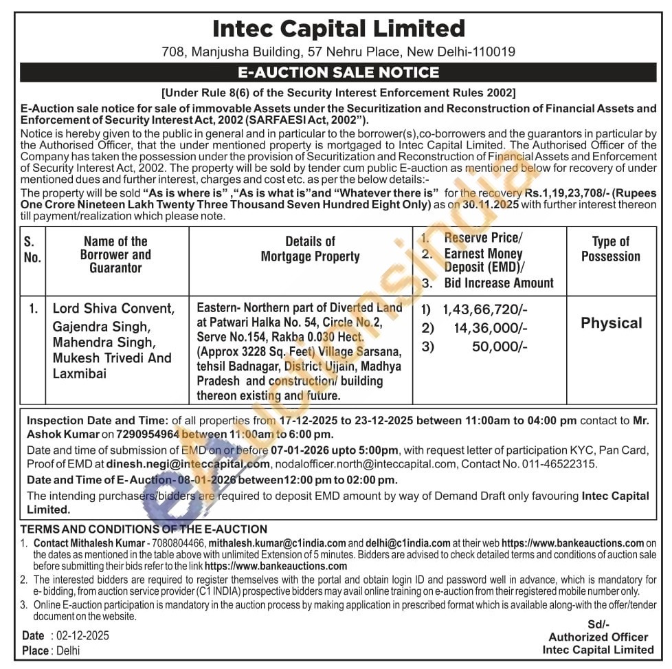 Eastern- Northern part of Diverted Land at Patwari Halka No. 54, Circle No.2, Serve No.154, Rakba 0.030 Hect. (Approx 3228 Sq. Feet) Village Sarsana, tehsil Badnagar, District Ujjain, Madhya Pradesh and construction/ building thereon existing and future.