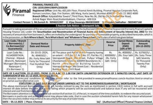 All The piece and Parcel of the Property having an extent - O.D.No: 37, N.D.No. 37, Flat No: F2, Veerapandi Nagar 3Rd Street, Pullyur Village Choolaimedu Chennai 600094 Boundaries As North-Residential Building South Veerapandi Nagar 38d Street East: Residential Building West:-24 Ft Road
