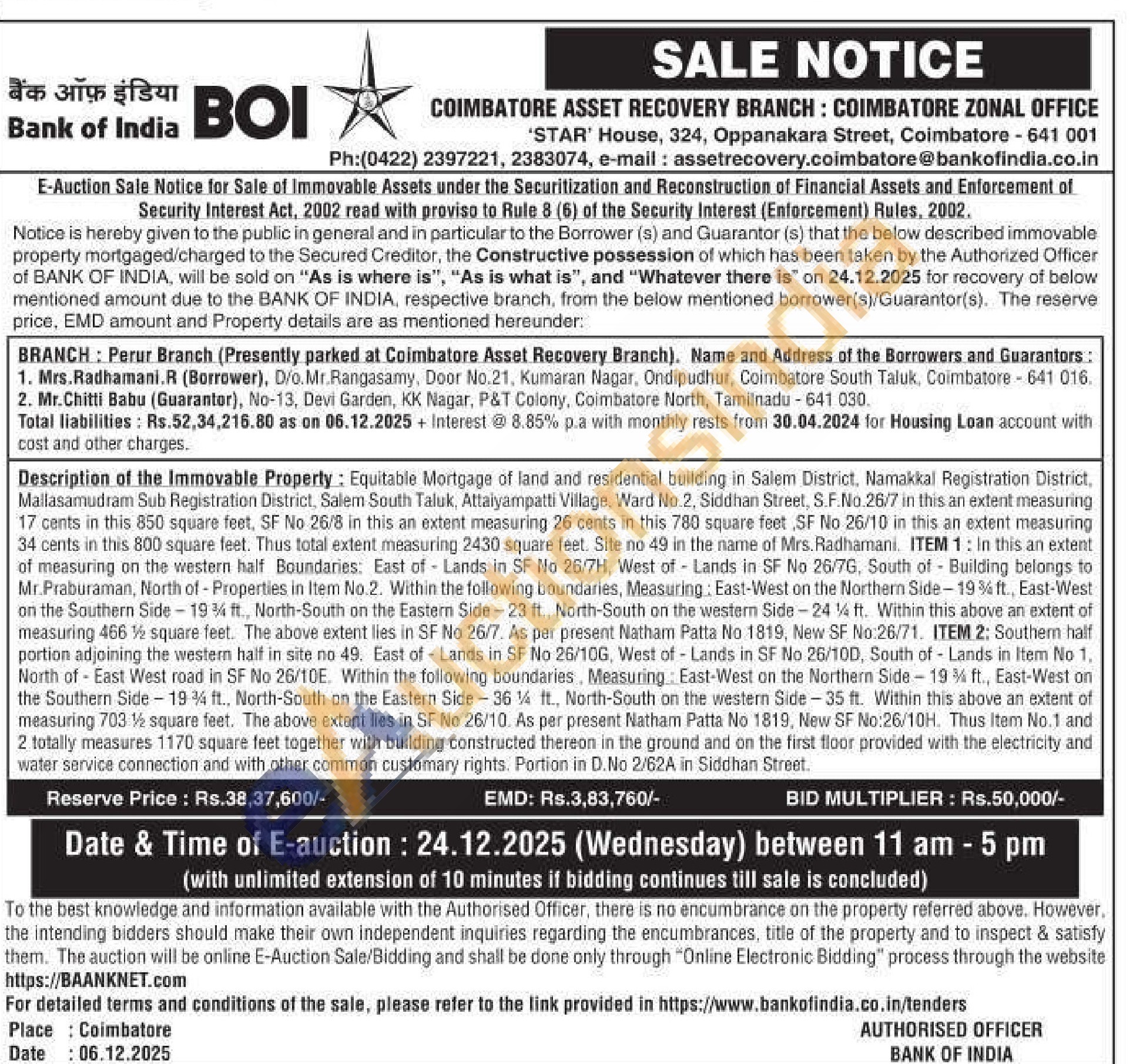 Description of the Immovable Property: Equitable Mortgage of land and residential building in Salem District, Namakkal Registration District, Mallasamudram Sub Registration District, Salem South Taluk, Attaiyampatti Village, Ward No.2, Siddhan Street, S.F.No.26/7 in this an extent measuring 17 cents in this 850 square feet, SF No 26/8 in this an extent measuring 26 cents in this 780 square feet,SF No 26/10 in this an extent measuring 34 cents in this 800 square feet. Thus total extent measuring 2430 square feet. Site no 49 in the name of Mrs. Radhamani. ITEM 1: In this an extent of measuring on the western half Boundaries: East of Lands in SF No 26/7H, West of Lands in SF No 26/7G, South of Building belongs to Mr.Praburaman, North of - Properties in Item No.2. Within the following boundaries, Measuring: East-West on the Northern Side-19% ft., East-West on the Southern Side-1934 ft., North-South on the Eastern Side-23 ft., North-South on the western Side-24 14 ft. Within this above an extent of measuring 466 ½ square feet. The above extent lies in SF No 26/7. As per present Natham Patta No 1819, New SF No:26/71. ITEM 2: Southern half portion adjoining the western half in site no 49. East of Lands in SF No 26/10G, West of Lands in SF No 26/10D, South of Lands in Item No 1, North of East West road in SF No 26/10E. Within the following boundaries, Measuring: East-West on the Northern Side-19% ft., East-West on the Southern Side-19% ft., North-South on the Eastern Side-3614 ft., North-South on the western Side-35 ft. Within this above an extent of measuring 703 1½ square feet. The above extent lies in SF No 26/10. As per present Natham Patta No 1819, New SF No:26/10H. Thus Item No.1 and 2 totally measures 1170 square feet together with building constructed thereon in the ground and on the first floor provided with the electricity and water service connection and with other common customary rights. Portion in D. No 2/62A in Siddhan Street
