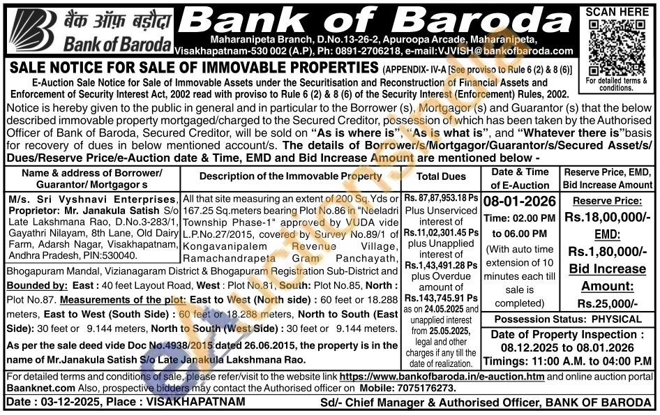 All that site measuring an extent of 200 Sq. Yds or 167.25 Sq.meters bearing Plot No.86 in "Neeladri Township Phase-1" approved by VUDA vide L.P.No.27/2015, covered by Survey No.89/1 of Kongavanipalem Revenue Village, Ramachandrapeta Gram Panchayath,Bhogapuram Mandal, Vizianagaram District & Bhogapuram Registration Sub-District and Bhogapuram Mandal, Vizianagaram Bounded by: East: 40 feet Layout Road, West: Plot No.81, South: Plot No.85, North: Plot No.87. Measurements of the plot: East to West (North side): 60 feet or 18.288 meters, East to West (South Side): 60 feet or 18.288 meters, North to South (East Side): 30 feet or 9.144 meters, North to South (West Side): 30 feet or 9.144 meters
