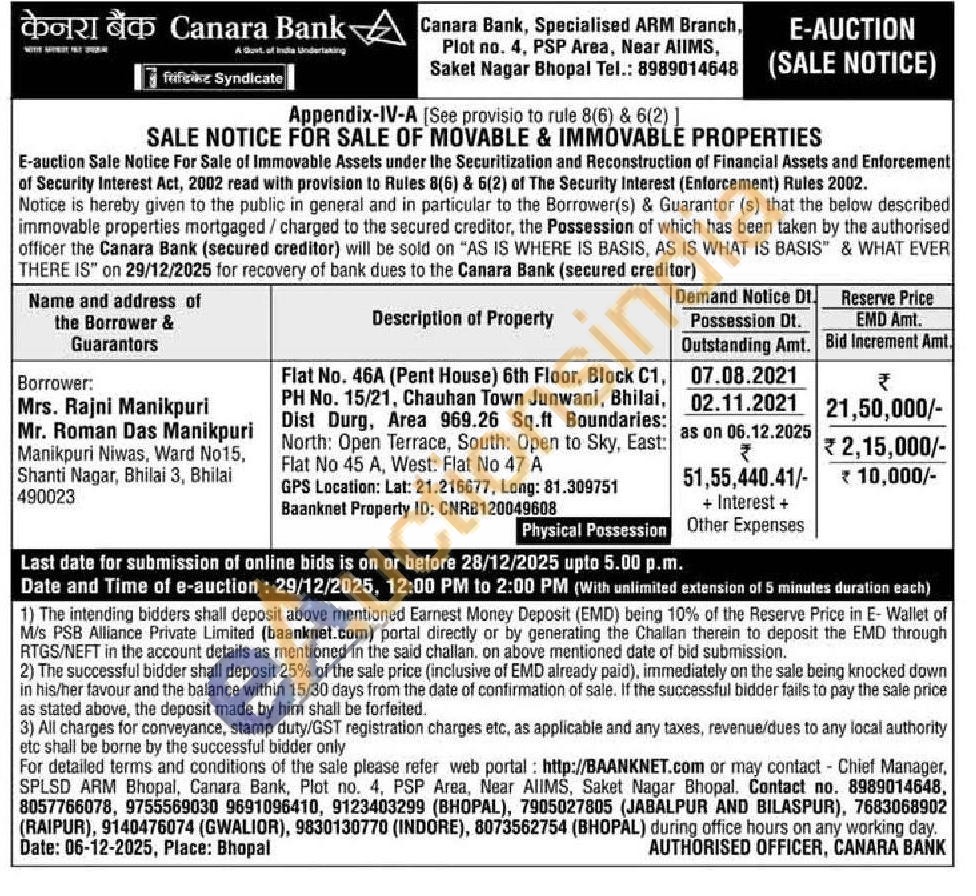 Flat No. 46A (Pent House) 6th Floor, Block C1, PH No. 15/21, Chauhan Town Junwani, Bhilai, Dist Durg, Area 969.26 Sq.ft Boundaries: North: Open Terrace, South: Open to Sky, East: Flat No 45 A, West: Flat No 47 A GPS Location: Lat: 21.216677, Long: 81.309751 Baanknet Property ID: CNRB120049608