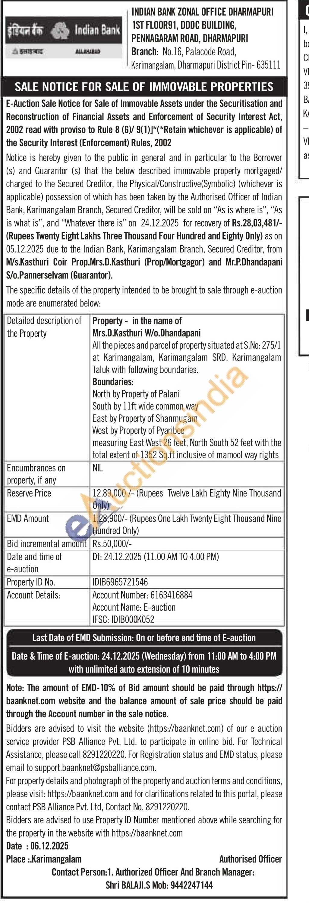 All the pieces and parcel of property situated at S.No: 275/1 at Karimangalam, Karimangalam SRD, Karimangalam Taluk with following boundaries. Boundaries: North by Property of Palani South by 11ft wide common way East by Property of Shanmugam West by Property of Pyaribee measuring East West 26 feet, North South 52 feet with the total extent of 1352 Sq.ft inclusive of mamool way rights