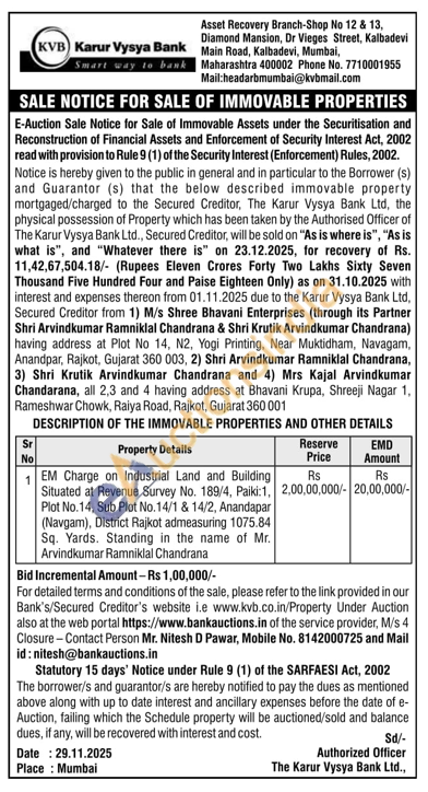 EM Charge on Industrial Land and Building Situated at Revenue Survey No. 189/4, Paiki: 1, Plot No. 14, Sub Plot No.14/1 & 14/2, Anandapar (Navgam), District Rajkot admeasuring 1075.84 Sq. Yards. Standing in the name of Mr. Arvindkumar Ramniklal Chandrana