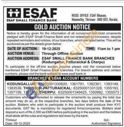 ESAF SMALL FINANCE BANK Gold Auctions Auction in Thrissur