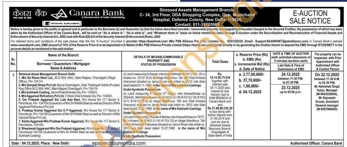 (1)Land measuring 8 Kanals vide khewat/khata no 18/13 min, 20 in khasra no 10/12/ (8-0) at village Mandhour, Teh and Distt Ambala (Haryana) situated on Jarout Road vide intkal no. 2912 vide Sale deed dated 02.11.1988 in the name of Mis Subhash Castings Under Symbolic Possession () Land measuring 4 Kanals 07 Martas vide khewat/khata no 383/424, 384/425 in khasra no. 9/14/2/2 (0-18) 9/15/1(0-18) 9/15/2 (4-7) 9/14/1/2 (6-4) at village Mandhour, Teh and Distt Ambala (Haryana) situated on Jarout Road vide intikal no. 2912 vide Sale deed dated 17.02.1989 in the name of Mis Subhash Castings Under Symbolic Possession