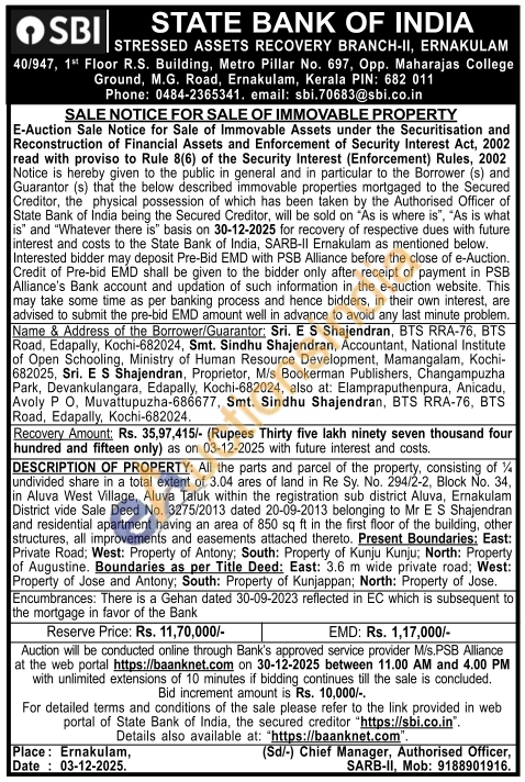 DESCRIPTION OF PROPERTY: All the parts and parcel of the property, consisting of undivided share in a total extent of 3.04 ares of land in Re Sy. No. 294/2-2, Block No. 34, in Aluva West Village, Aluva Taluk within the registration sub district Aluva, Ernakulam District vide Sale Deed No. 3275/2013 dated 20-09-2013 belonging to MrES Shajendran and residential apartment having an area of 850 sq ft in the first floor of the building, other structures, all improvements and easements attached thereto. Present Boundaries: East: Private Road, West: Property of Antony; South: Property of Kunju Kunju; North: Property of Augustine. Boundaries as per Title Deed: East: 3.6 m wide private road; West: Property of Jose and Antony; South: Property of Kunjappan; North: Property of Jose