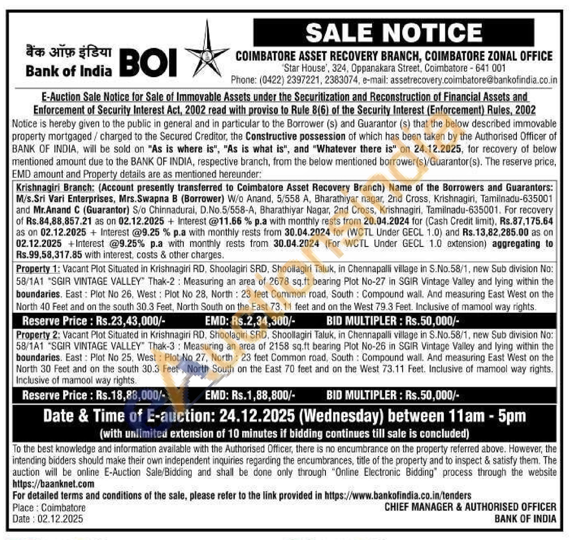 Property 1: Vacant Plot Situated in Krishnagiri RD, Shoolagiri SRD, Shoollagiri Taluk, in Chennapalli village in S.No.58/1, new Sub division No: 58/1A1 SGIR VINTAGE VALLEY" Thak-2: Measuring an area of 2678 sq.ft bearing Plot No-27 in SGIR Vintage Valley and lying within the boundaries. East: Plot No 26, West: Plot No 28, North: 23 feet Common road, South Compound wall. And measuring East West on the North 40 Feet and on the south 30.3 Feet, North South on the East 73.11 feet and on the West 79.3 Feet. Inclusive of mamool way rights.