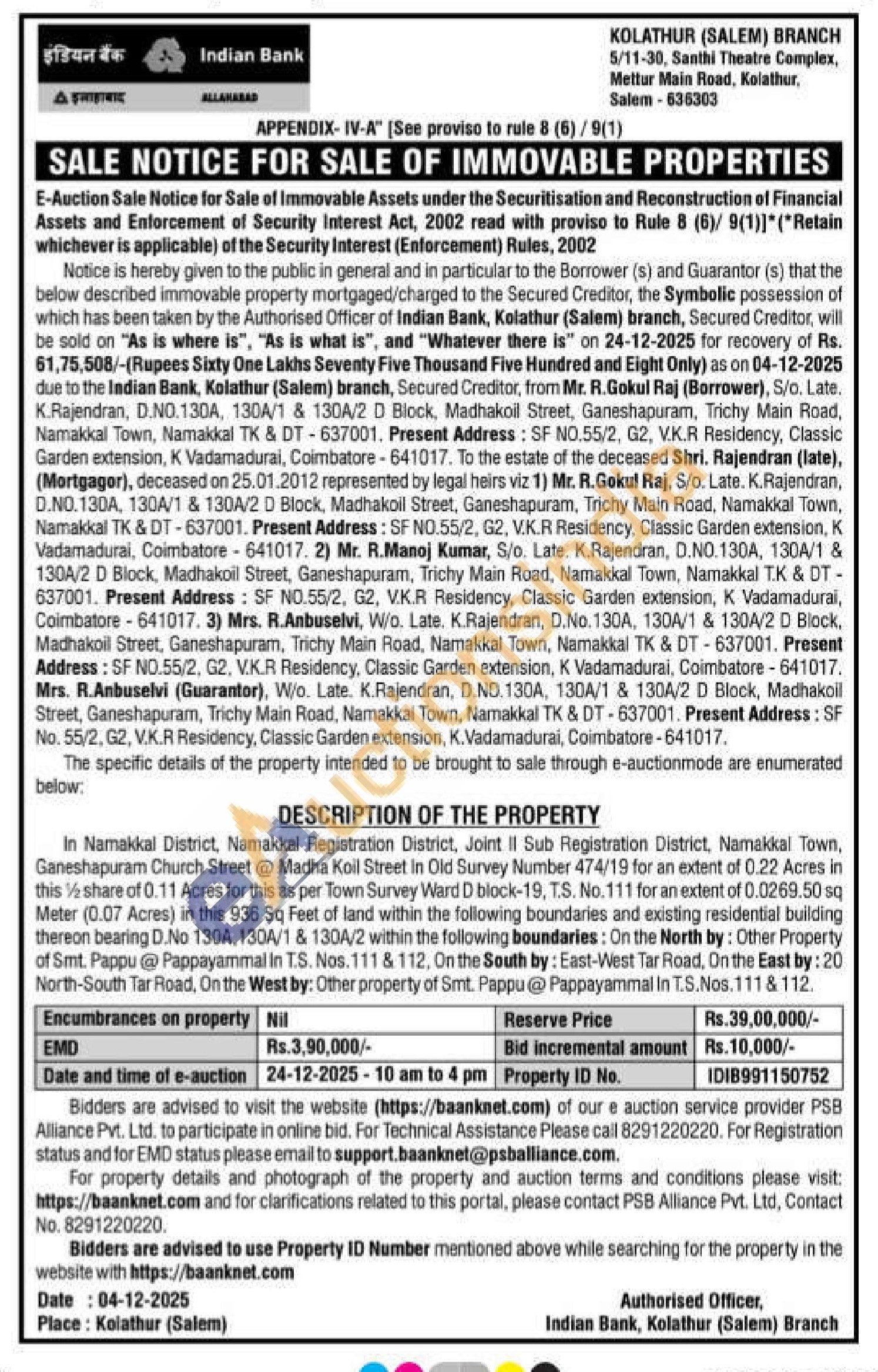 In Namakkal District, Namakkal Registration District, Joint II Sub Registration District, Namakkal Town, Ganeshapuram Church Street @ Madha Koil Street In Old Survey Number 474/19 for an extent of 0.22 Acres in this share of 0.11 Acres for this as per Town Survey Ward D block-19, T.S. No. 111 for an extent of 0.0269.50 sq Meter (0.07 Acres) in this 936 Sq Feet of land within the following boundaries and existing residential building thereon bearing D.No 130A, 130A/1 & 130A/2 within the following boundaries: On the North by: Other Property of Smt. Pappu @ Pappayammal In T.S. Nos. 111 & 112, On the South by: East-West Tar Road, On the East by: 20 North-South Tar Road, On the West by: Other property of Smt. Pappu @ Pappayammal In T.S. Nos. 111 & 112.