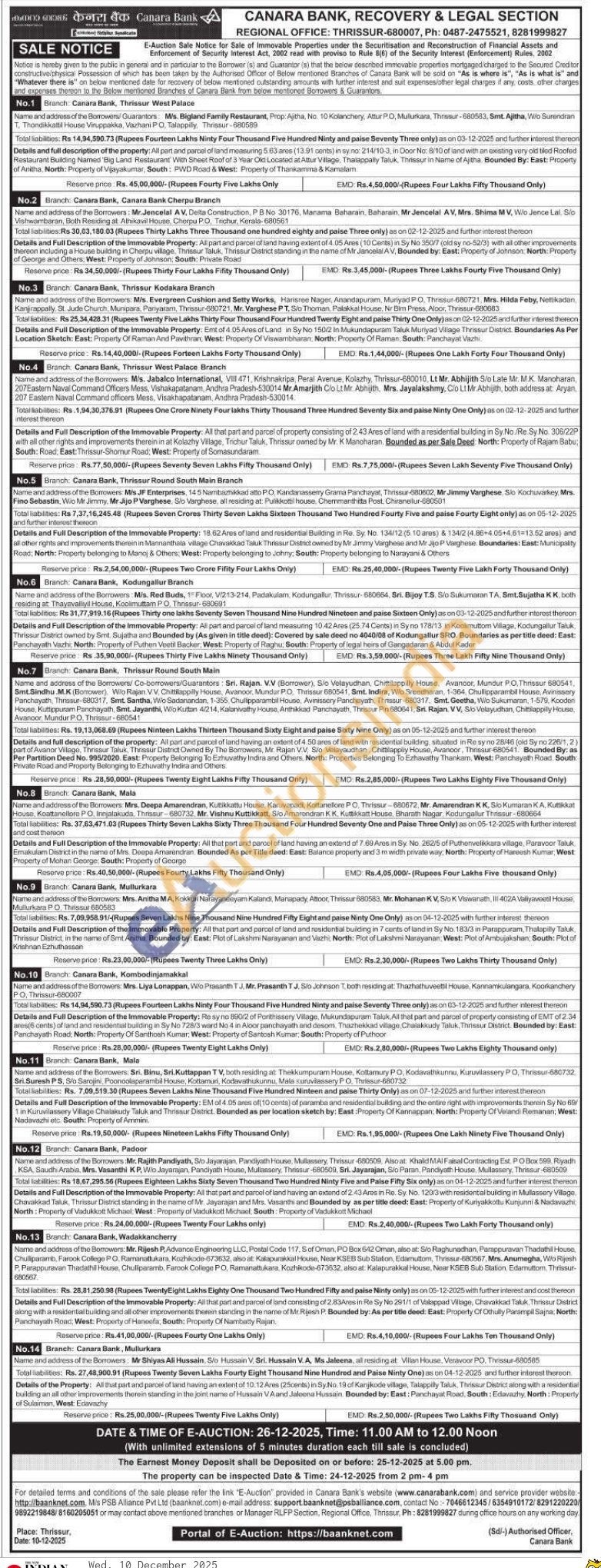 9) All that part and parcel of land and residential building in 7 cents of land in Sy No. 183/3 in Parappuram, Thalapilly Taluk Thrissur District, in the name of Smt Anitha. Bounded by: East: Plot of Lakshmi Narayanan and Vazhi North: Plot of Lakshmi Narayanan, West: Plot of Ambujakshan, South: Plot of Krishnan Ezhuthassan