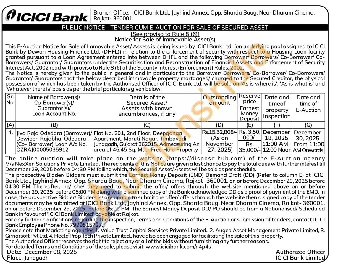 Flat No. 201, 2nd Floor, Deepganga Apartment, Maruti Nagar, Timbavadi, Junagadh, Gujarat 362015. Admeasuring An area of 46.45 Sq. Mtr.- Free Hold Property