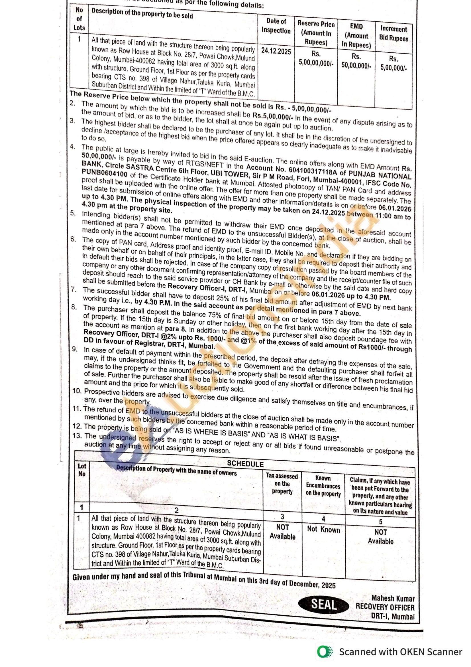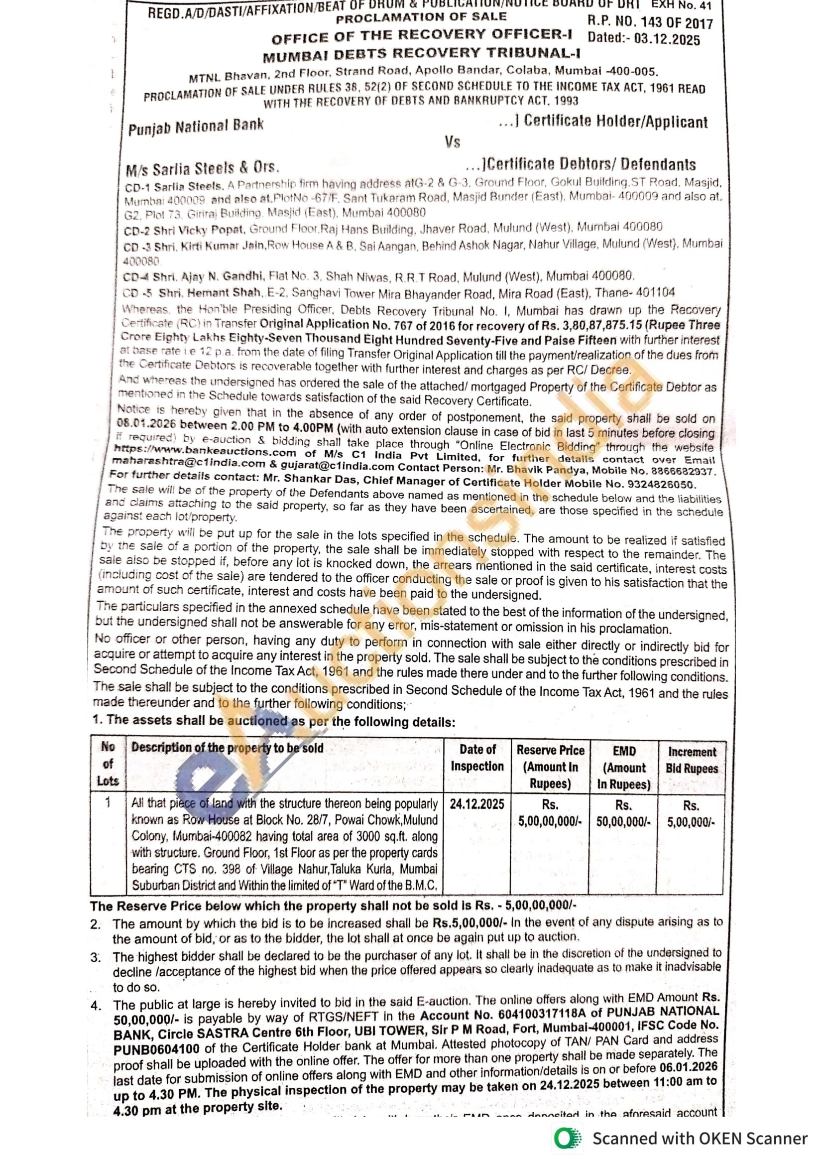 All that piece of land with the structure thereon being popularly known as Row House at Block No. 28/7, Powai Chowk, Mulund Colony, Mumbai-400082 having total area of 3000 sq.ft. along with structure. Ground Floor, 1st Floor as per the property cards bearing CTS no. 398 of Village Nahur, Taluka Kuria, Mumbai Suburban District and Within the limited of "T" Ward of the B.M.C