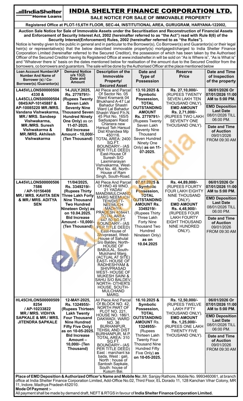 All Piece And Parcel OF HNO 49 WNO. 21 YADAV MANDIMULCHAND MARG NEEMUCH TEH/DISTT-NEEMUCH MADHYA PRADESH 458441. TOTAL AREA: 447.50 SQ.FT. BOUNDARY:- (AS PER TITLE DEED) East-House of Shivprasad, West-House of Sahulal S/o Baldev, North-HOUSE OF BABULAL, South-Mulchand Marg.