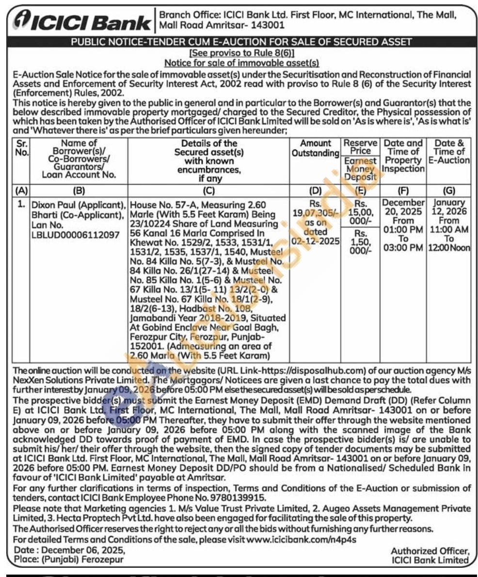 House No. 57-A, Measuring 2.60 Marle (With 5.5 Feet Karam) Being 23/10224 Share of Land Measuring 56 Kanal 16 Maria Comprised In Khewat No. 1529/2, 1533, 1531/1, 1531/2, 1535, 1537/1, 1540, Musteel No. 84 Killa No. 5(7-3), & Musteel No. 84 Killa No. 26/1(27-14) & Musteel No. 85 Killa No. 1(5-6) & Musteel No. 67 Killa No. 13/1(5-11) 13/2(2-0) & Musteel No. 67 Killa No. 18/1(2-9), 18/2(6-13), Hadbast No. 108, Jamabandi Year 2018-2019, Situated At Gobind Enclave Near Goal Bagh, Ferozpur City, Ferozpur, Punjab-152001. (Admeasuring an area of 2.60 Marla (With 5.5 Feet Karam