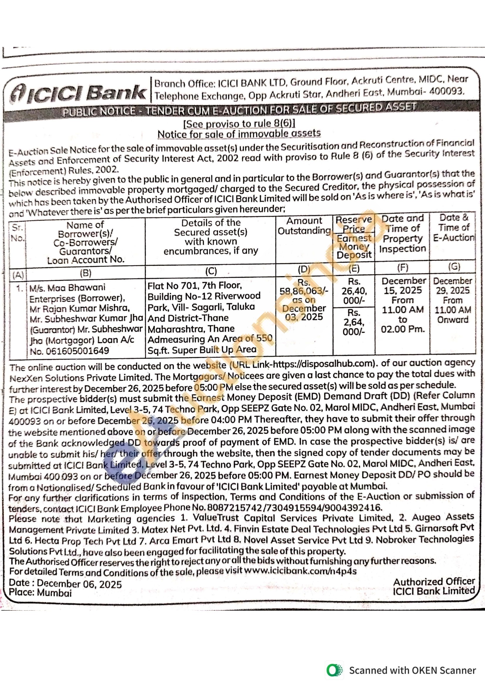 Flat No 701, 7th Floor, Building No-12 Riverwood Park, Vill- Sagarli, Taluka And District-Thane Maharashtra, Thane Admeasuring An Area of 550 Sq.ft. Super Built Up Area