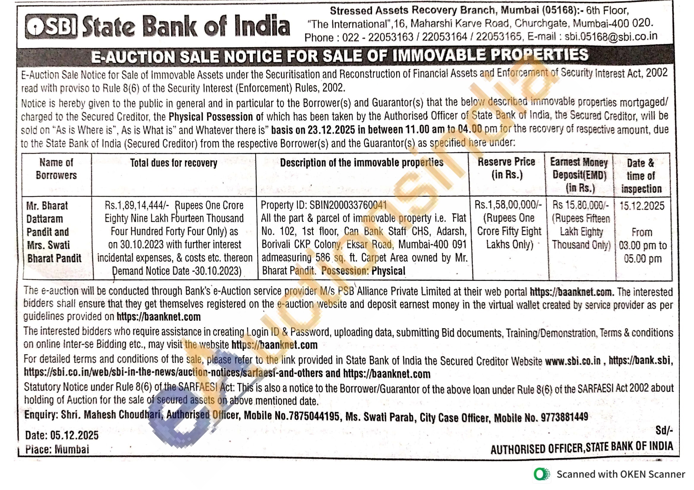 Property ID: SBIN200033760041 All the part & parcel of immovable property i.e. Flat No. 102, 1st floor, Can Bank Staff CHS, Adarsh, Borivali CKP Colony, Eksar Road, Mumbai-400 091 admeasuring 586 sq. ft. Carpet Area owned by Mr. Bharat Pandit. Possession: Physical