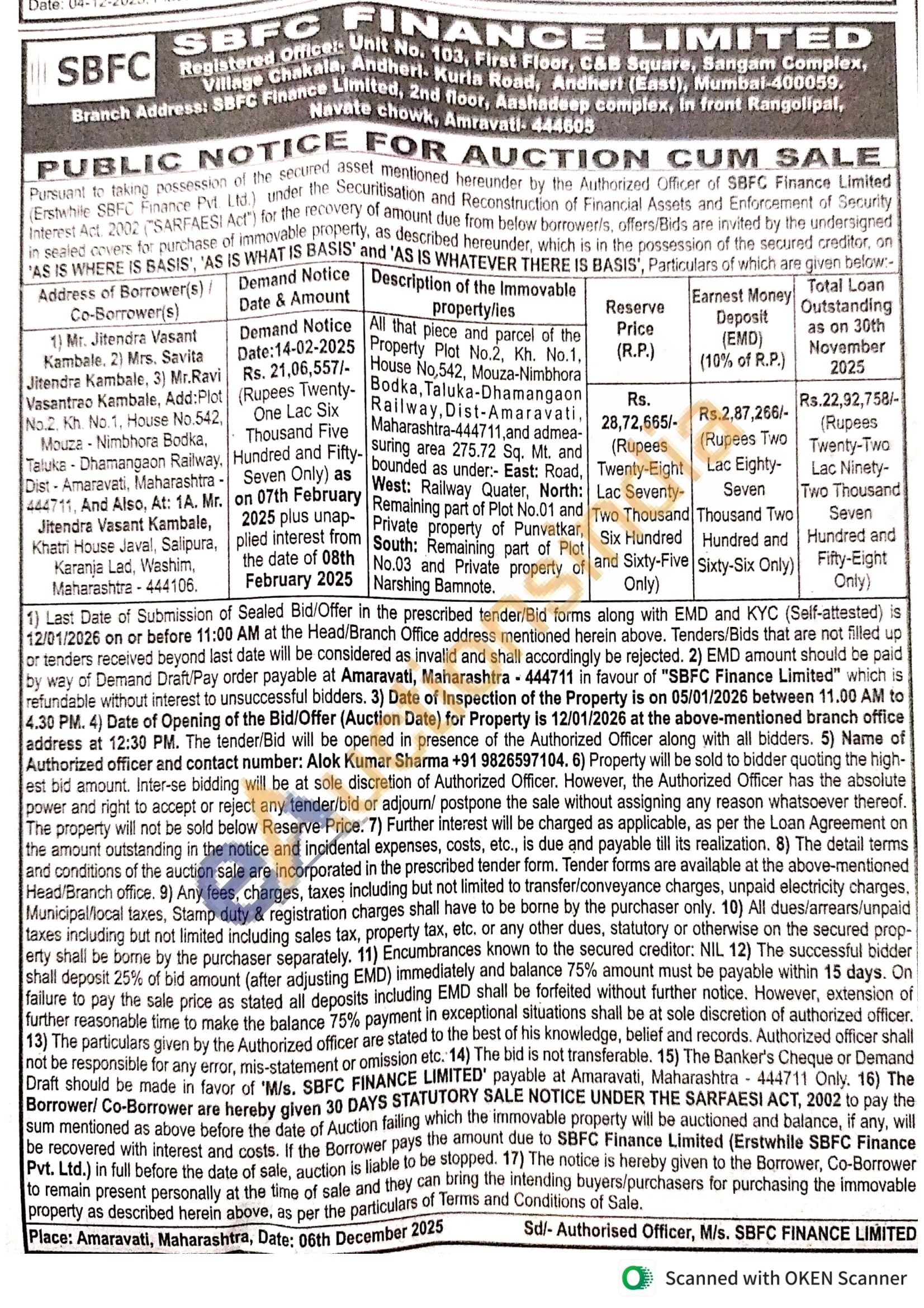 Contact Authorized officer and contact number: Alok Kumar Sharma +91 9826597104