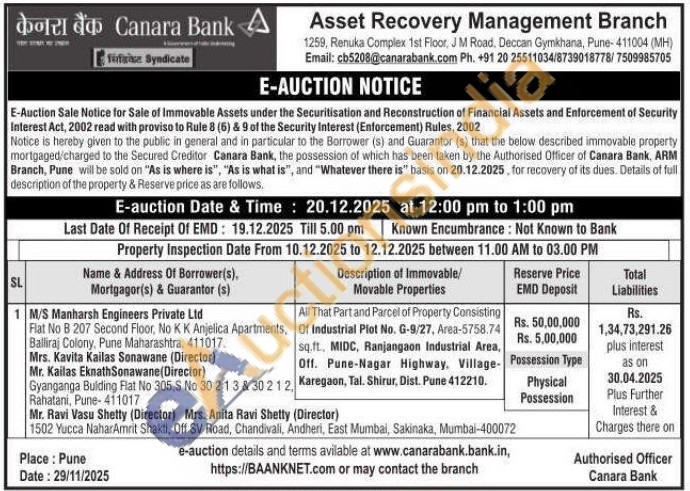 All That Part and Parcel of Property Consisting Of Industrial Plot No. G-9/27, Area-5758.74 sq.ft., MIDC, Ranjangaon Industrial Area, Off. Pune-Nagar Highway. Village-Karegaon, Tal. Shirur, Dist. Pune 412210.