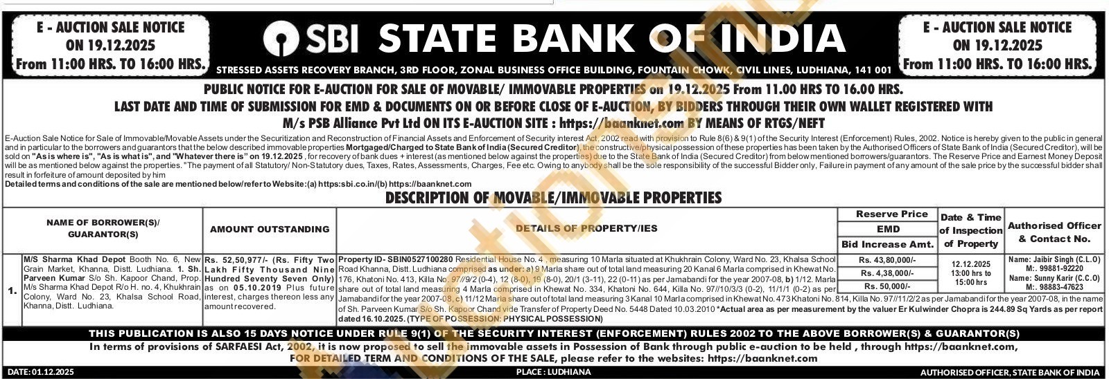 Property ID-SBIN0527100280 Residential House No. 4, measuring 10 Marla situated at Khukhrain Colony, Ward No. 23, Khalsa School Road Khanna, Distt. Ludhiana comprised as under: a) 9 Marla share out of total land measuring 20 Kanal 6 Marla comprised in Khewat No. 176, Khatoni No. 413, Killa No. 97/9/2 (0-4), 12 (8-0), 19 (8-0), 20/1 (3-11), 22 (0-11) as per Jamabandi for the year 2007-08, b) 1/12. Marla share out of total land measuring 4 Marla comprised in Khewat No. 334, Khatoni No. 644, Killa No. 97//10/3/3 (0-2), 11/1/1 (0-2) as per Jamabandi for the year 2007-08, c) 11/12 Marla share out of total land measuring 3 Kanal 10 Marla comprised in Khewat No. 473 Khatoni No. 814, Killa No. 97//11/2/2 as per Jamabandifor the year 2007-08, in the name of Sh. Parveen Kumar S/o Sh. Kapoor Chand vide Transfer of Property Deed No. 5448 Dated 10.03.2010 "Actual area as per measurement by the valuer Er Kulwinder Chopra is 244.89 Sq Yards as per report