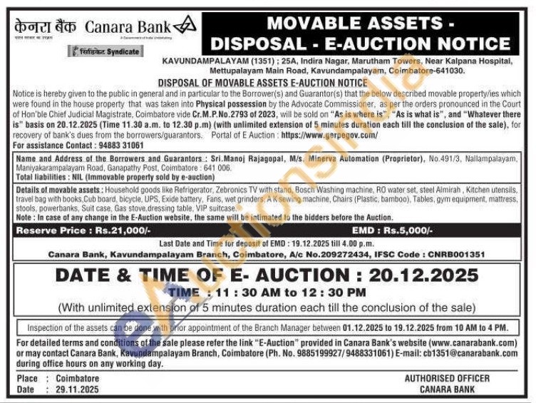 Details of movable assets: Household goods like Refrigerator, Zebronics TV with stand, Bosch Washing machine, RO water set, steel Almirah, Kitchen utensils, travel bag with books, Cub board, bicycle, UPS, Exide battery, Fans, wet grinders, AK sewing machine, Chairs (Plastic, bamboo), Tables, gym equipment, mattress, stools, powerbanks, Suit case, Gas stove, dressing table, VIP suitcase. Note: In case of any change in the E-Auction website, the same will be intimated to the bidders before the Auction