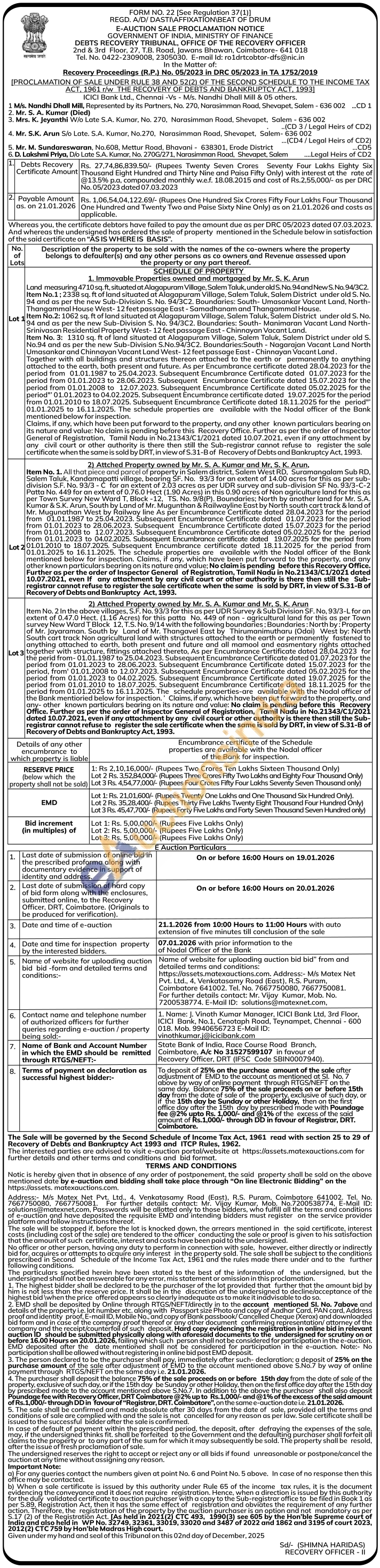 Item No. 2 In the above villages, S.F. No. 93/3 for this as per UDR Survey & Sub Division SF. No, 93/3-L for an extent of 0.47.0 Hect. (1.16 Acres) for this patta No. 449 of non agricultural land for this as per Town survey New Ward T Block 12, T.S. No. 9/14 with the following boundaries; Boundaries: North by: Property of Mr. Jayaraman. South by Land of Mr. Thangavel East by Thirumanimutharu (Odai) West by: North South cart track Non agricultural land with structures attached to the earth or permanently fastened to anything attached to earth, both present and future and all mamool and easmentary rights attached together with structure, fittings attached thereto, As per Encumbrance Certificate dated 28.04.2023 for the perid from-01.01.1987 to 25.04.2023. Subsequent Encumbrance Certificate dated 01.07.2023 for the period from 01.01.2023 to 28.06.2023. Subsequent Encumbrance Certificate dated 15.07.2023 for the period, from' 01.01.2008 to 12.07.2023. Subsequent Encumbrance Certificate dated 05.02.2025 for the period from 01.01.2023 to 04.02.2025. Subsequent Encumbrance Certificate dated 19.07.2025 for the period from 01.01.2010 to 18.07.2025. Subsequent Encumbrance Certificate dated 18.11.2025 for the period from 01.01.2025 to 16.11.2025. The schedule properties-are available with the Nodal officer of the Bank mentioried below for inspection. Claims, if any, which have been put forward to the property, and any- other known particulars bearing on its nature and value: No claim is pending before this Recovery Office. Further as per the order of Inspector General of Registration, Tamil Nadu in No.21343/C1/2021 dated 10.07.2021, even if any attachment by any civil court or other authority is there then still the Sub-registrar cannot refuse to register the sale certificate when the same is sold by DRT, in view of S.31-B of Recovery of Debts and Bankruptcy Act, 1993.