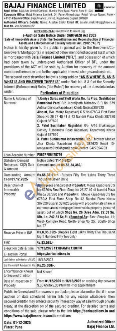 All the piece and parcel of Property I: Mouje Kapadvanj CS No 6780/A First Floor Shop No 26 27 40 41 Nandni Plaza Kheda 387620 and Property II: Mouje Kapadvanj C S No 6780/A First Floor Shop No 42 Nandni Plaza Kheda 387620 Gujarat 387620 along with proportionate share in common areas mortgaged immovable property (securedasset) out of which Shop No. 26 (Area Adm. 22.53 Sq. Mtr. i.e. 242.51 Sq.Ft.) Bounded As:-East-Shop No. 41; West-Complex Road: North-Shop No. 25: South-Shop No. 27