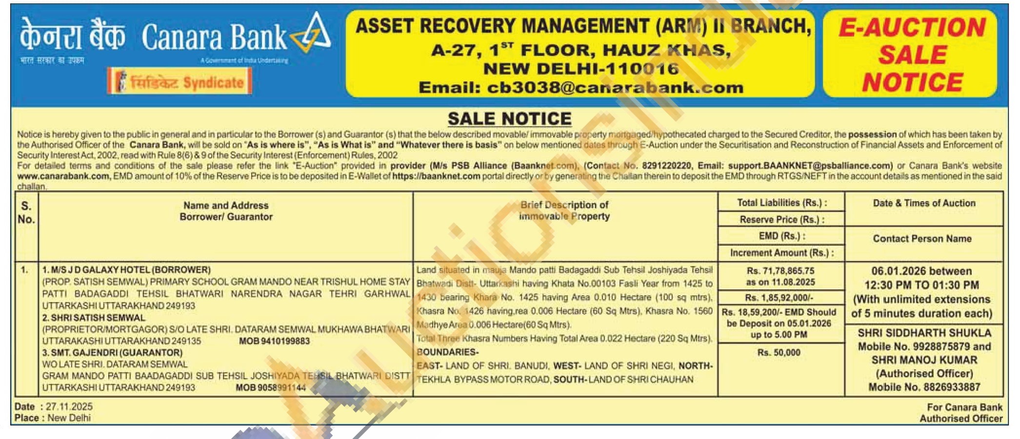 SHRI SIDDHARTH SHUKLA Mobile No. 9928875879 and SHRI MANOJ KUMAR (Authorised Officer) Mobile No. 8826933887