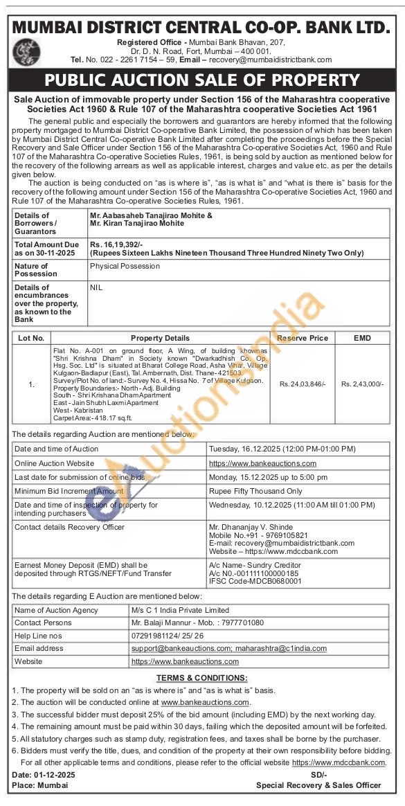 Flat No. A-001 on ground floor, A Wing, of building khownas "Shri Krishna Dham" in Society known "Dwarkadhish Co. Op. Hsg. Soc. Ltd" is situated at Bharat College Road, Asha Vihar, Village Kulgaon-Badlapur (East), Tal. Ambernath, Dist. Thane-421503. Survey/Plot No. of land:- Survey No. 4, Hissa No. 7 of Village Kulgaon. Property Boundaries:- North-Adj. Building South Shri Krishana Dham Apartment East-Jain Shubh Laxmi Apartment West-Kabristan Carpet Area:-418.17 sq.ft.