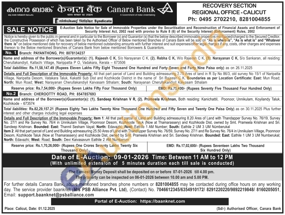 Details and Full Description of the Immovable Property: All that part parcel of Land and Building admeasuring 2.75 Ares of land in R Sy No 86/3, old survey No 15/1 of Naripatta Village, Naripatta Desom, Vatakara Taluk, Kakattil Sub Dist and Kozhikode District in the name of Sri Rajeesh C K. Boundaries as per Location Certificate: East: Mun Road; North: Mun Road; West: Narayanan Cherullakandiyil Kaivasam Sthalam; South: Narayanan Cherullakandiyil Kaivasam Sthalam