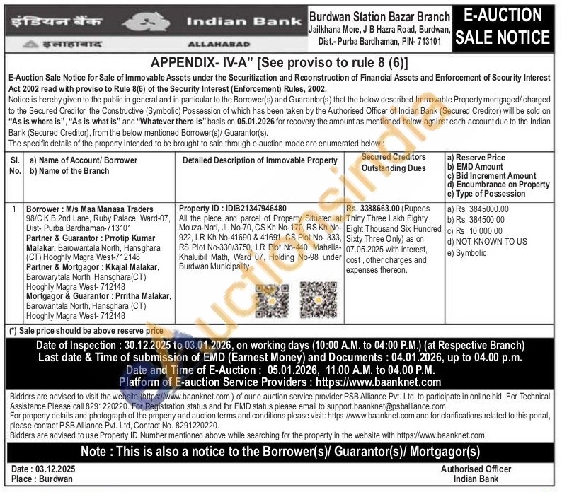 All the piece and parcel of Property Situated at Mouza-Nari, JL No-70, CS Kh No-170, RS Kh No-922, LR Kh No-41690 & 41691, CS Plot No-333, RS Plot No-330/3750, LR Plot No-440, Mahalla-Khaluibil Math, Ward 07, Holding No-98 under Burdwan Municipality
