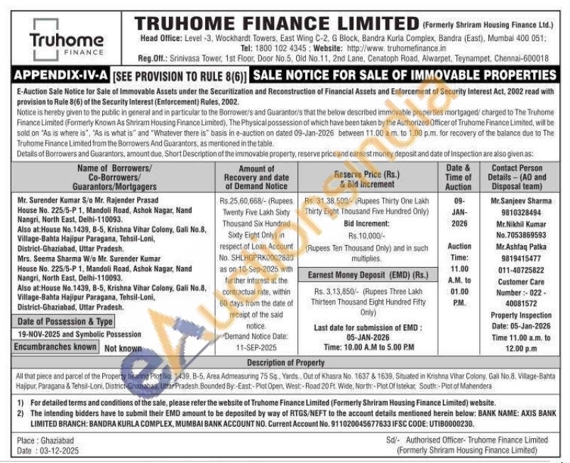 All that piece and parcel of the Property bearing Plot No. 1439, B-5, Area Admeasuring 75 Sq., Yards. Out of Khasra No. 1637 & 1639, Situated in Krishna Vihar Colony, Gali No.8, Village-Bahta Hajipur, Paragana & Tehsil-Loni, District-Ghaziabad, Uttar Pradesh Bounded By:-East-Plot Open, West: Road 20 Ft. Wide, North-Plot Of Istekar, South-Plot of Mahendera