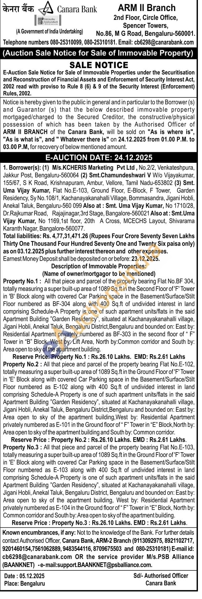 Property No.3: All that piece and parcel of the property bearing Flat No.E-103, totally measuring a super built-up area of 1089 Sq.ft in the Ground Floor of 'F' Tower in 'E' Block along with covered Car Parking space in the Basement/Surface/Stilt Floor numbered as E-103 along with 400 Sq.ft of undivided interest in land comprising Schedule-A Property is one of such apartment units/flats in the said Apartment Building "Garden Residency", situated at Kachanayakanahalli village, Jigani Hobli, Anekal Taluk, Bengaluru District, Bengaluru and bounded on: East by: Area open to sky of the apartment building, West by: Residential Apartment privately numbered as E-104 in the Ground floor of " F" Tower in "E" Block, North by: Common corridor and South by: Area open to sky of the apartment building.