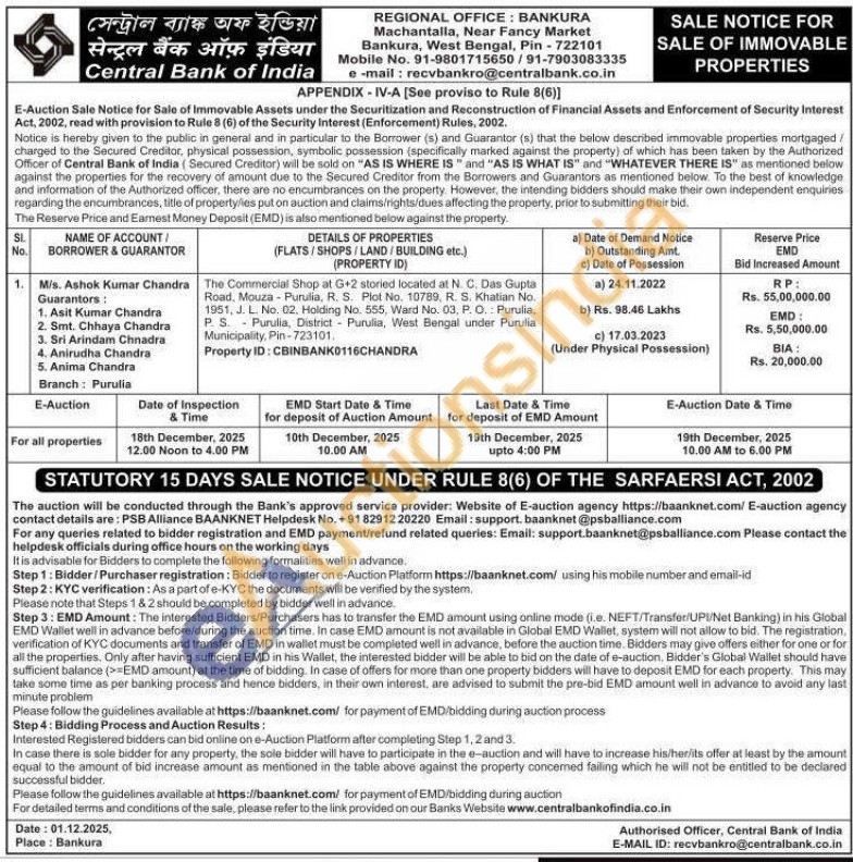 The Commercial Shop at G+2 storied located at N. C. Das Gupta Road, Mouza-Purulia, R. S. Plot No. 10789, R. S. Khatian No. 1951, J. L. No. 02. Holding No. 555. Ward No. 03, P. O. Purulia, P. S. Purulia, District Purulia, West Bengal under Purulia Municipality, Pin-723101.