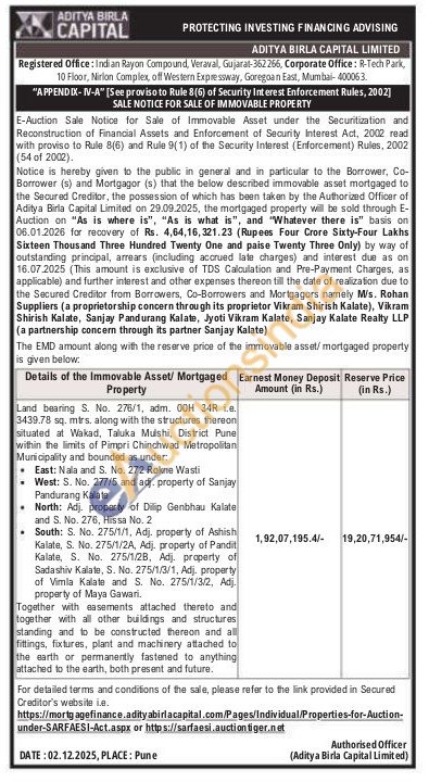 Land bearing S. No. 276/1, adm. 00H 34R Le. 3439.78 sq. mtrs. along with the structures thereon situated at Wakad, Taluka Mulshi, District Pune within the limits of Pimpri Chinchwad Metropolitan Municipality and bounded as under:Municipality and bounded as under: East: Nala and S. No. 272 Rokne Wasti West: S. No. 277/5 and adj. property of Sanjay Pandurang Kalate North: Adj. property of Dilip Genbhau Kalate and S. No. 276, Hissa No. 2 South: S.. No. 275/1/1, Adj. property of Ashish Kalate, S. No. 275/1/2A, Adj. property of Pandit Kalate, S. No. 275/1/28, Adj. property of Sadashiv Kalate, S. No. 275/1/3/1, Adj. property of Vimla Kalate and S. No. 275/1/3/2, Adj. property of Maya Gawari Together with easements attached thereto and together with all other buildings and structures standing and to be constructed thereon and all fittings, fixtures, plant and machinery attached to the earth or permanently fastened to anything attached to the earth, both present and future