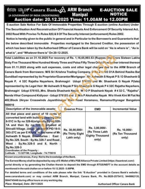 All that piece and parcel of 10 cents of converted land with building bearing DNo 6-51C in Sy no 328-6(originally Sy no 328-1A and then Sy no 328-5) situated at Shivalli Village, Udupi Taluk with PID 19-5-503-27C as per E Khata in the name of Mr. Ashwath S Nayak. Boundaries: East: Sy.No.329, South: Sy.No.328-7 and Road, West Sy.No.328-5 and 8. North:Sy.No.328-3 Coordinates of the Property: