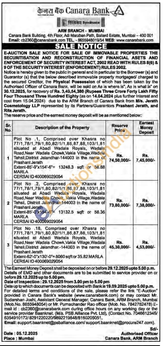Plot No 2, Comprised over Khasra no 77/1,78/1,79/1,80,82/1/1,86,87,88,103/1,81 situated at Abadi Wadala Royals, Wadala Road, Near Wadala Chowk, Vakla Village, Wadala Tehsil, District Jalandhar-144003 in the name of Prashant Jerath Extent-85-0"x154'-6" 13132.5 sqft or 58.36 MARLA
